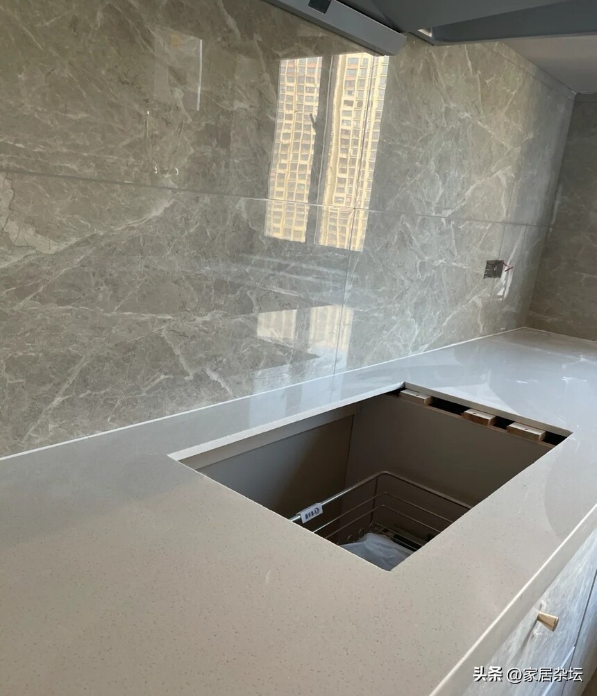 五:台面厚度 对于橱柜台面恒青厨房板,我们还需要关注另外一个问题就是台面的厚度。如果我们没有提前确认,基本上都会踩坑。 橱柜台面的厚度是越厚越好。