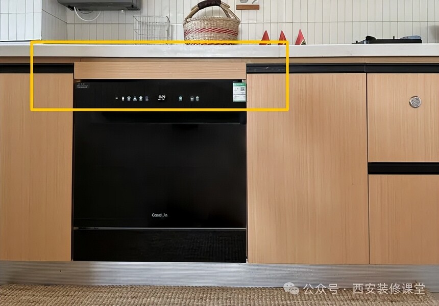 正确做法应该是先吊顶,而且吊顶高度不是随心所欲,必须是定制商给的高度,这样吊柜与吊顶才能严丝合缝,不仅仅是美观,更是定制的价值。 03.有洗碗机定制水平有限