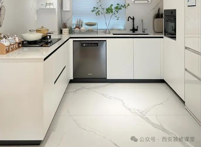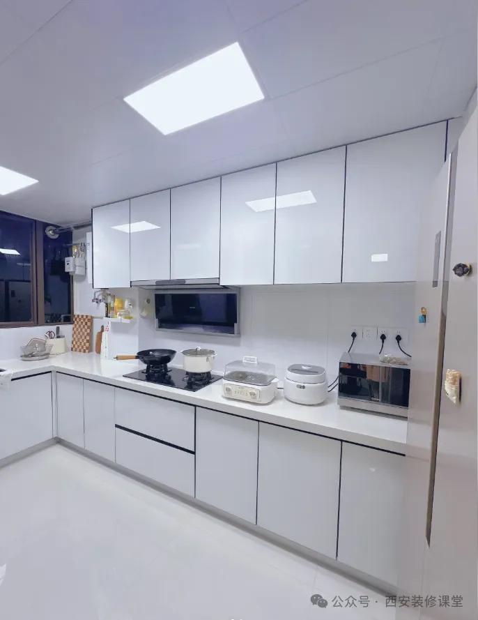 厨房铝扣板吊顶,地面还是瓷砖,不会有太大误差,但是做了很宽的边线,如果不是先装橱柜后吊顶的话,就是定制商能力有限,看似有价格,但是降低价值了,虽然不影响使用。《厨房吊柜与吊顶翻车,太常见了》