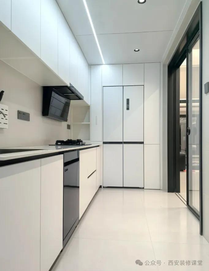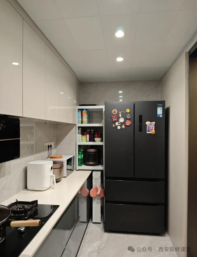 装修里头任何东西最好不要大面积亮光,否则百分百没有高级感,虽然不影响功能性,但是整体颜值审美完全失败。 07.舍不得镶嵌冰箱,结果越住越乱