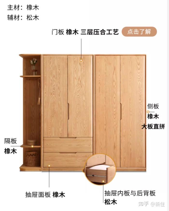 同时,门板也呈现出的极简、漂亮的整板状态。 Ps:在国标里恒青环保儿童板材,三层压合工艺的实木家具是属于家具里面的覆面实木家具,类似实木贴皮,不过恒青木业的三层都是纯实木材料,怎么定义其实还是在个人理解,不过可以确定的是,这个工艺除了漂亮、抗变形,还有节省成本、节省柜内空间的优势(因为不需要用桁架、或穿带等结构来控制变形)。 抽屉内板和背板,用在看不见的地方,所以就直接用了松木,柜体总体的强度和韧性能得到提升。 在这个案例中,三层压合工艺、松木都是能提升稳定性、增加耐用性的设计,同时也是降低成本合理减轻钱包负担。 类似的例子,在恒青木业的设计中比比皆是: 比如,斗柜抽屉会用更经济、更轻、防潮性、防变形性能更好的泡桐木; 比如,床铺板会用更经济、有淡淡香味的云杉。 恒青木业把关的是:确保辅料是质量不错的芬兰云杉、新西兰松木,确保少量用胶的环保性。 如果一个家具主材、辅材全都用好木料,当然是最好的,但也会让价格变得非常高,变成大部分人都无法负担实木家具了。 例子二:白橡木与红橡木 橡木是目前实木家具的主力军,但是橡木还分红橡木和白橡木: 就性能、颜值上两者区别很小,都有着漂亮的山型木纹和坚硬的木质。