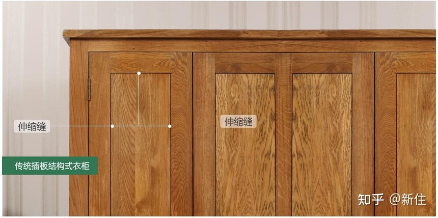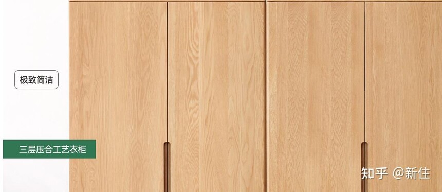 拿这个衣柜来说: 由于其侧板、隔板还有抽屉面板,板面不大,不用担心变形,所以都是直接用直拼的橡木大板做成的,以更好的展现的自然的木纹之美。 可到了门板,板面就大了变形风险增加,所以就需要上抗变形的工艺了。