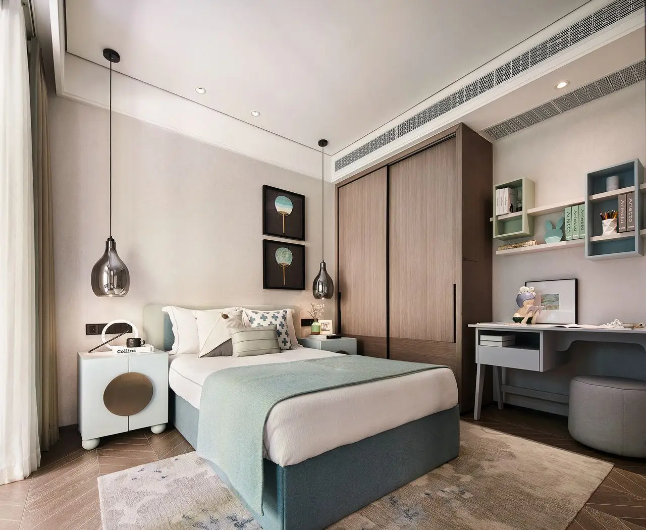 床和衣柜的颜色搭配原则是尽量接近,并与整个卧室色调协调恒青儿童家具,特别是与墙面、地面和软装饰颜色的匹配效果。