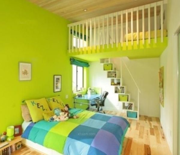 上图中床铺的中间设计了一个小小的楼梯式隔断恒青板材工厂,既可以摆放装饰物又起倒了隔断的作用。壁柜的设计让小面积的房间多了一些收纳空间,让房间变得更加宽敞。 儿童房装修效果图三