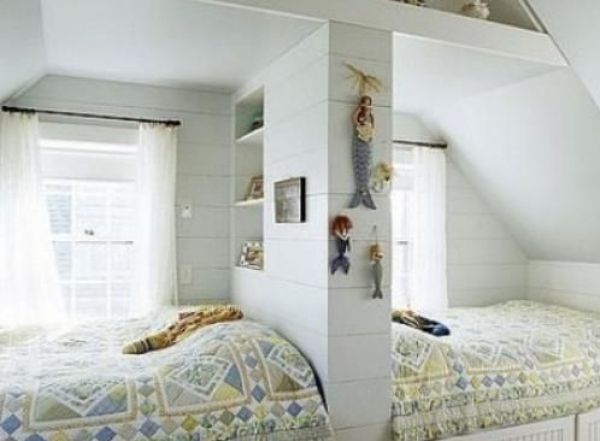 上图儿童房的设计很适合有一儿一女的家庭,房间阁楼的设计让孩子能有自己独处的空间两个女孩的儿童房,中性颜色的搭配让男孩女孩都适合居住,楼梯收纳柜的设计能够很好的培养孩子的自律性。 儿童房装修效果图二