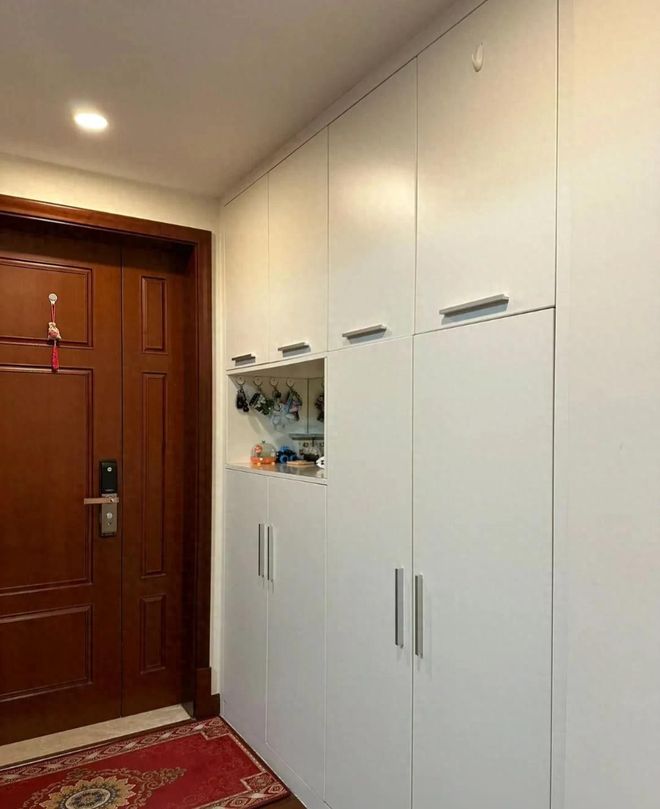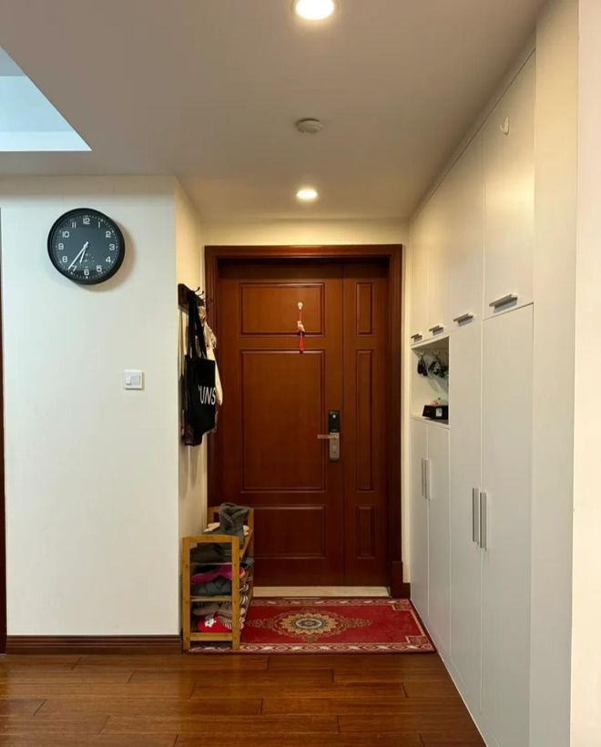 进来就是门厅区域,她们家做了一排的白色到顶柜子,可能也是有收纳的缘故,门厅区域干净如新恒青实木床,左边放置一个简易鞋架,鞋子都是整体的摆放着,没有一丝的凌乱。红色的地毯显得格外的喜庆!