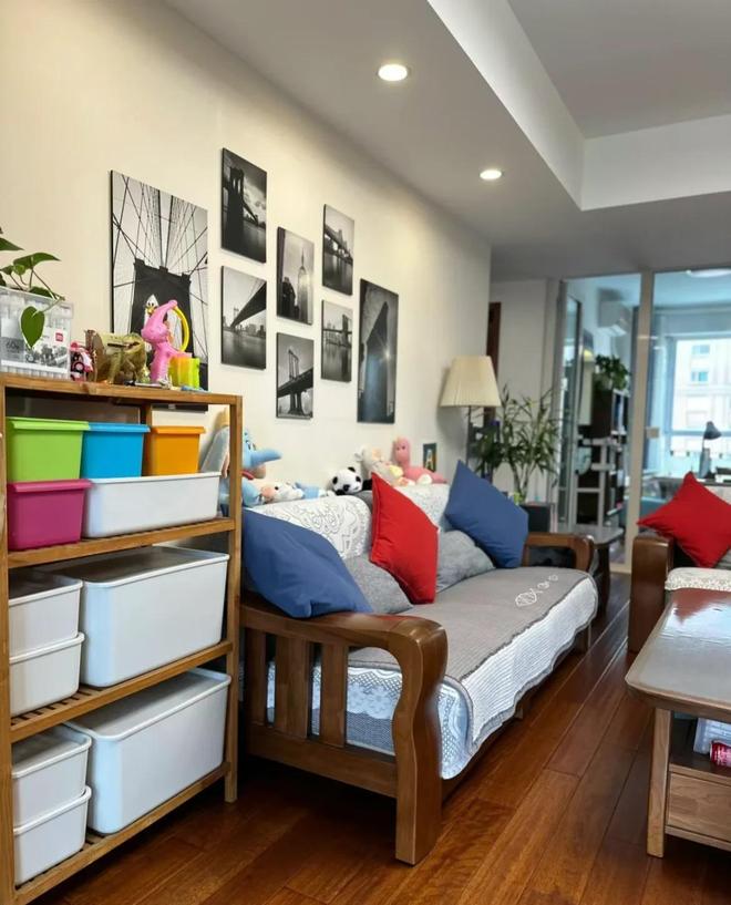 客厅区域装修风格上有些年头了,虽然没有豪华的装饰,复杂的造型,但是沙发上的抱枕、茶几上的塑料垫子干净得让人都不好意思去触摸。 沙发旁边的小置物架也是整齐地摆放着小盒子,物品分类明确,拿取方便。这种爱整理的习惯真不是一朝一夕养成的,关键是坚持了这么多年,可见女士是一个对生活有着极好热爱和追求的一个人。真心佩服屋主!