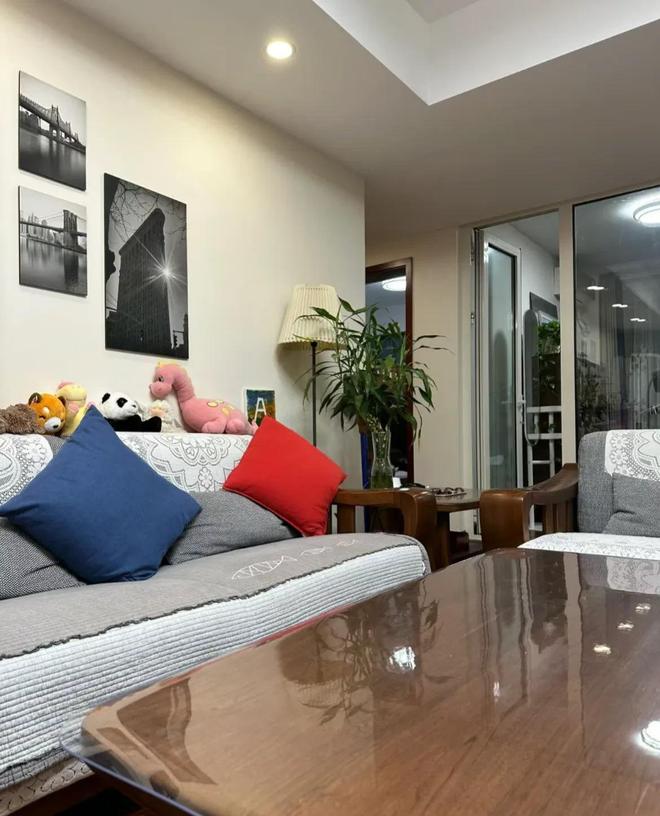 靠近客厅区域看过去,实木的地板泛着光泽,一点灰尘都看不到,真的太干净了。这一天?打扫多少遍啊。 沙发套看上去也是如此的干净,一点不显旧,足以体现了女主人对生活的态度和对生活的热爱。