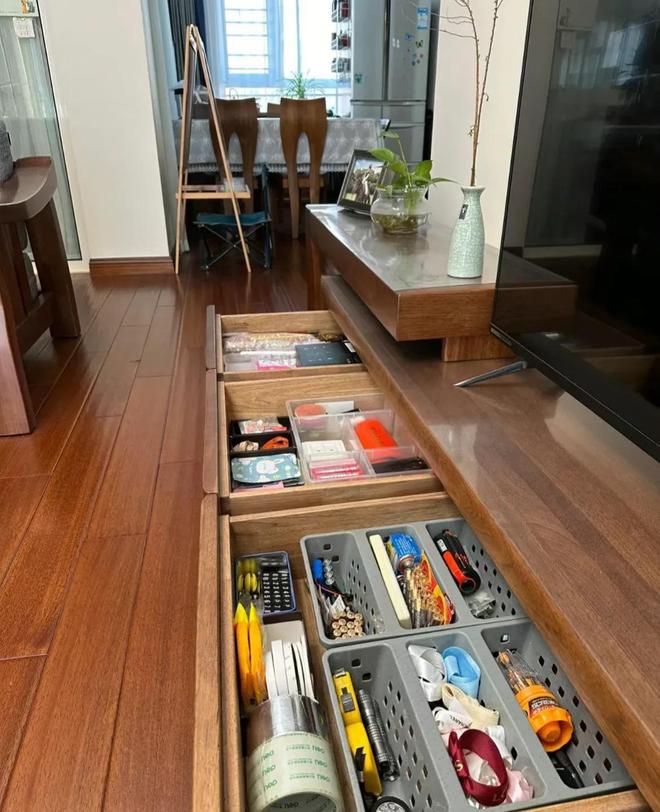 实木的电视柜看上去更加的上档次。抽屉里面整整齐齐的摆放着各种日常的生活用品,每个抽屉也是分类很明确,医药的像口罩、酒精棉、湿巾摆放在一个区域,方便分辨和拿取。 其他的像胶带、电池、盒尺等等放在一起,看着就让人很舒服。