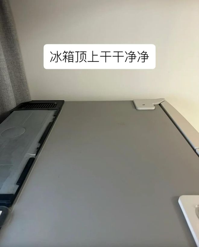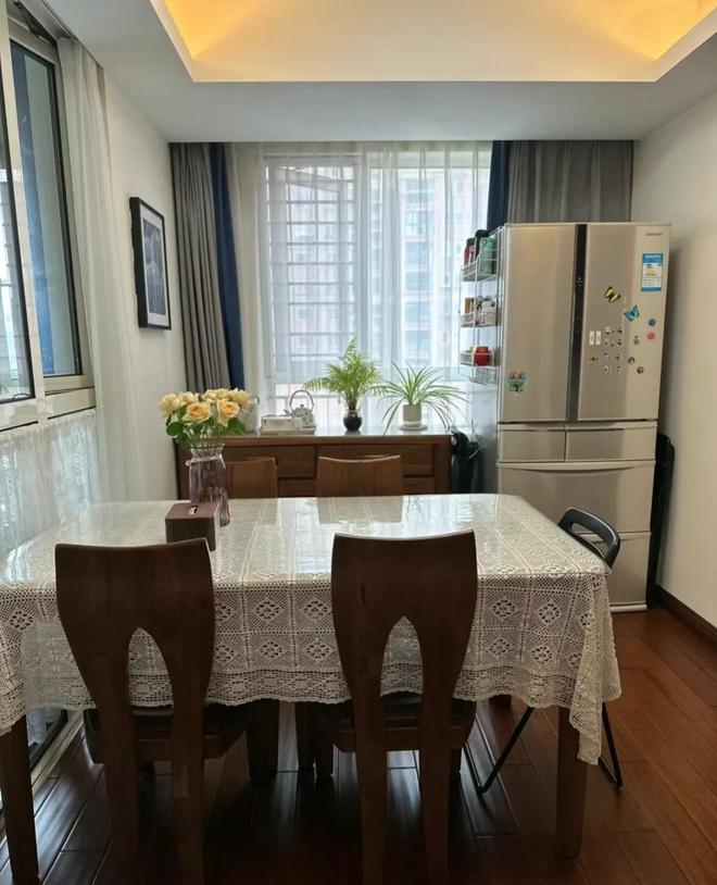 餐厅区域,被屋主打理得井井有条,干净如新。餐桌上除了放一盆小绿植之外,桌面上空无一物,那叫一个干净。餐椅也是整齐地摆放着,毫无凌乱感。冰箱的表面也被女主擦的干干净净,干净的发光。很多人会忽略冰箱顶面,可女主一点也不放过每一个角落。
