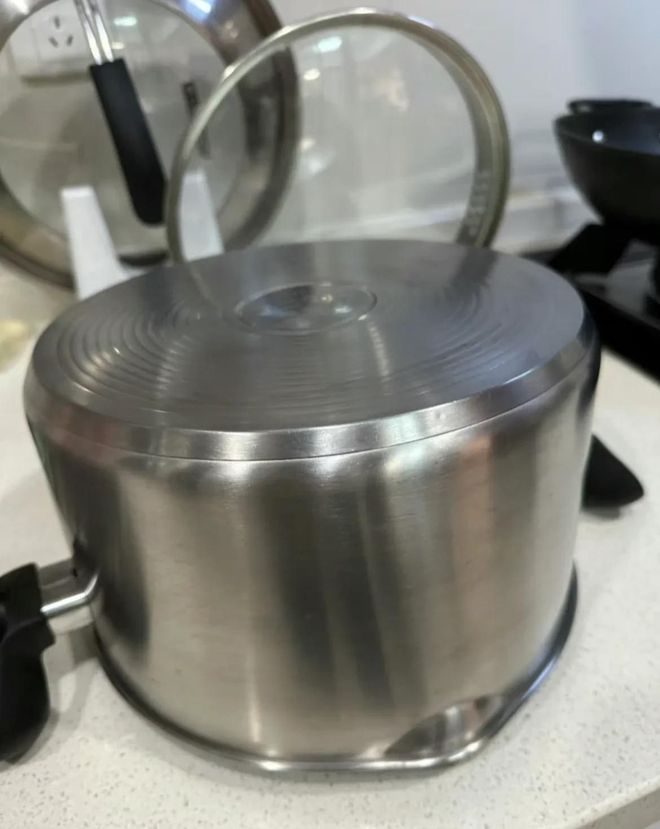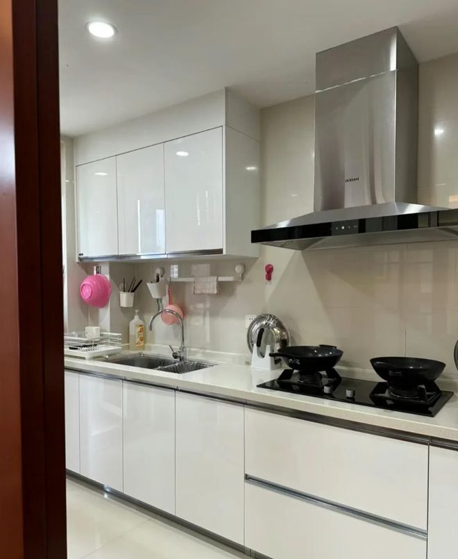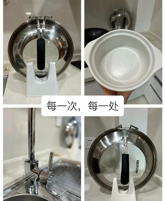 白色干净的小厨房也被女主收拾得那叫一个干净。地面上没有一丝的尘土,橱柜门板上也没有一点污渍,擦得干净透亮。各种的锅盖、锅具,女主也是用完就及时清洁,免得不好打理。 擦的干净的都不好意思用了。