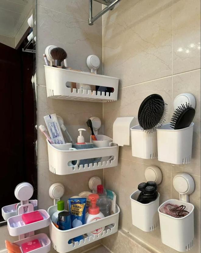 一家人的清洁用品,女主整理得井井有条。牙膏一个区域,肥皂、香皂各一个区域,刮胡刀、头绳各一个区域。梳子也是单独摆放,真的太会整理了。