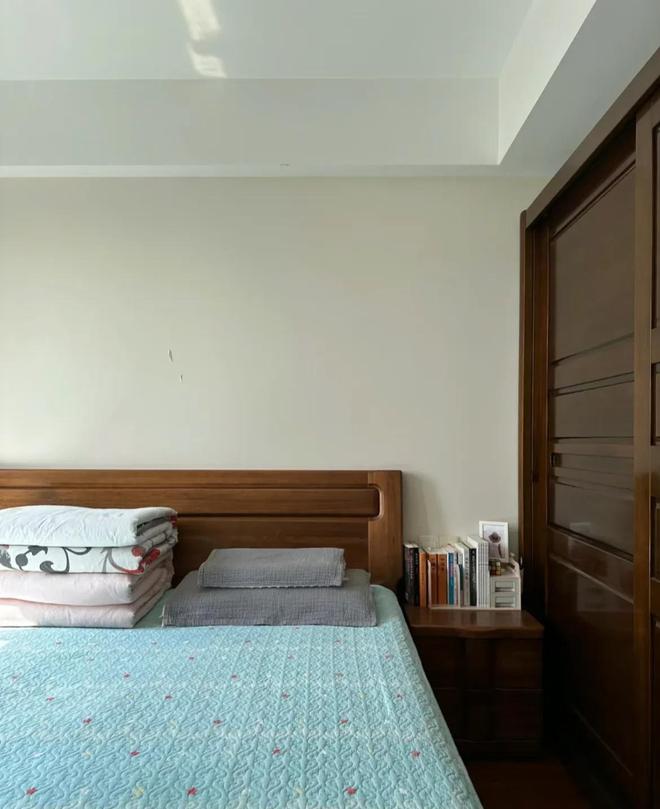 看看这卧室,浅蓝色的床单平整的铺满整个大床,被子整齐的叠放着,像豆腐块一样!太舒服了吧。