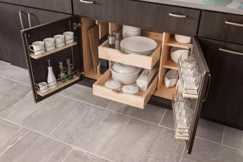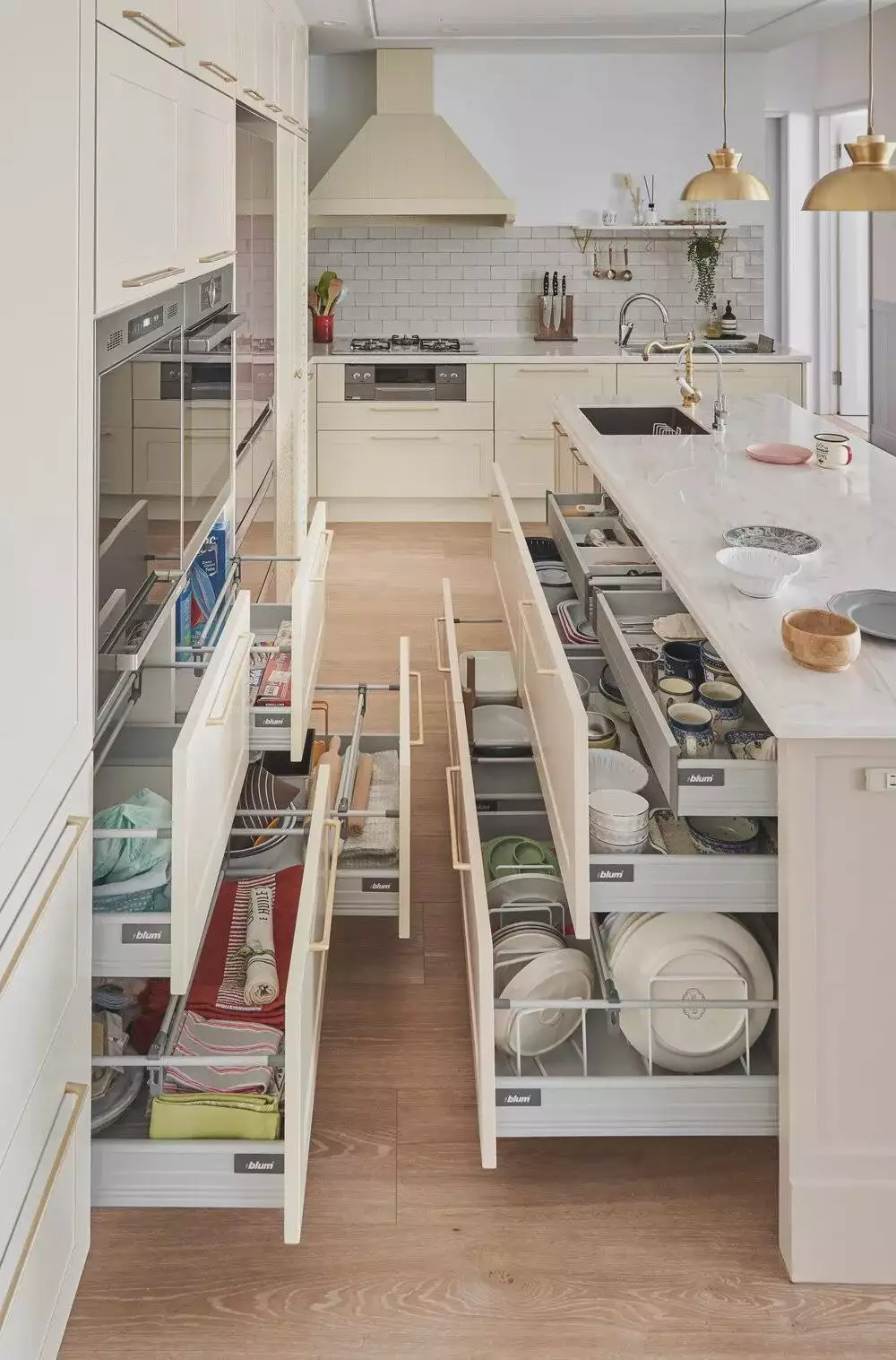 在国外,许多橱柜设计都采用了较薄的抽屉家庭橱柜内部设计,内部设有分隔格子,用于分类收纳不同的工具,这样的设计令强迫症的人看了都会感到十分舒适。