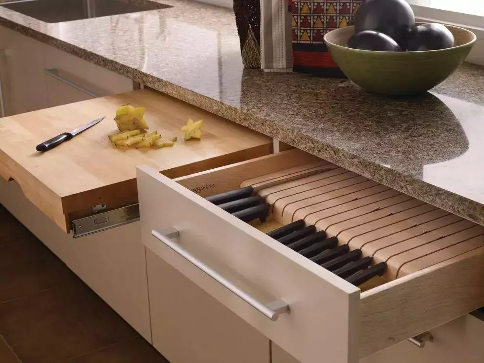 这个用抽屉导轨制作的砧板设计真的很有创意!如果是较厚的砧板,我还真想不到更好的收纳办法。