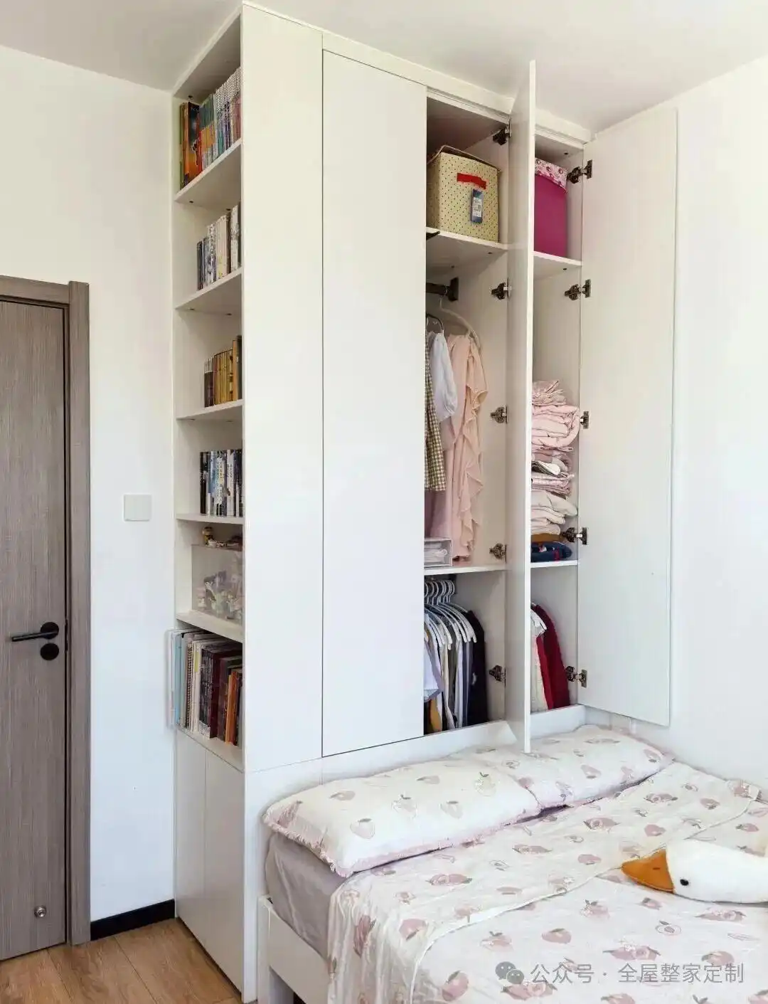 最终定的方案是:床头直接做1.1米宽的衣柜,衣柜侧面接580mm宽的开放书柜恒青大芯板,书桌摆在靠近窗户的另一侧。这样进门第一眼看到的是书柜而非拥挤的家具恒青实木床,走路动线也留足了60cm,娃蹦蹦跳跳都不碍事。 最让我惊喜的是衣柜门板的小细节。一开始担心床头摆枕头会挡住衣柜门,设计师建议下半部分做15cm的封板,刚好避开枕头的高度,现在开关衣柜门完全不卡顿,打扫卫生时擦封板也比擦缝隙省力。