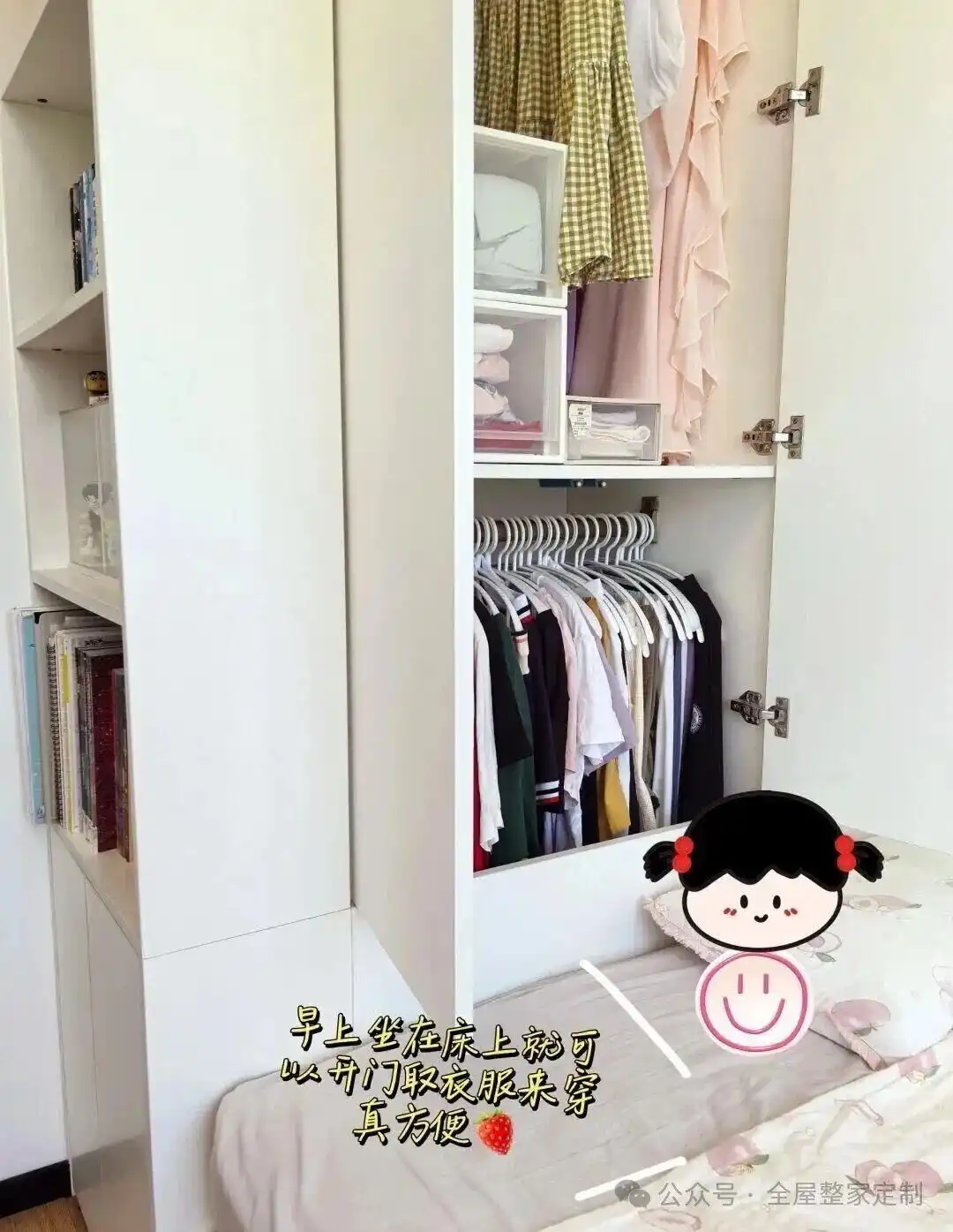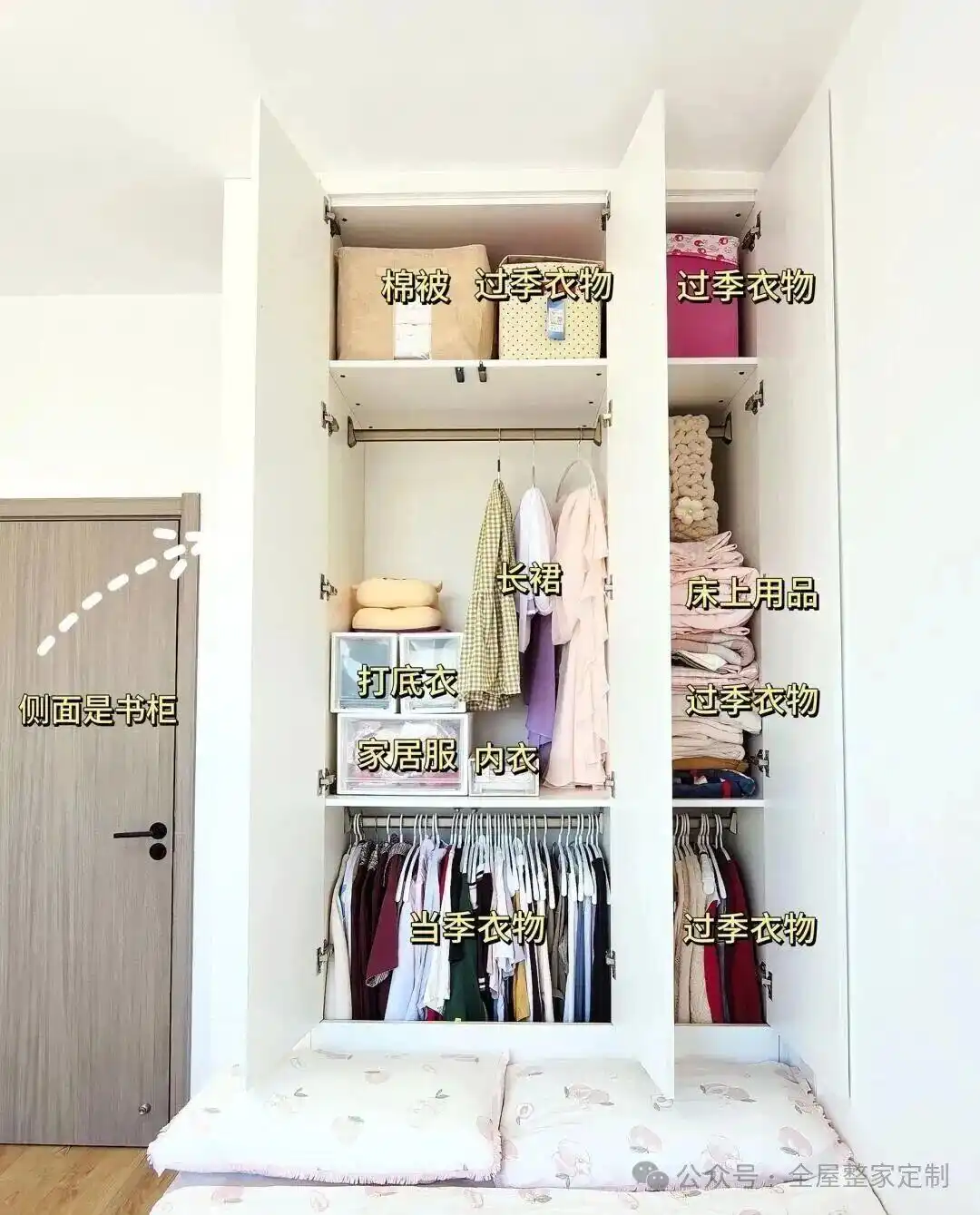 顶部是408mm高的储物区,专门放过季衣物和棉被。我买了几个收纳箱,把冬天的厚外套、羽绒服抽真空后放进去,整整塞了6床被子还有富余。这里要提醒大家,顶部高度别超过45cm,不然拿取时得搬凳子,孩子自己根本够不着。 中间区域是核心收纳区,我做了“挂衣+叠衣”的组合。左边留了80cm高的挂衣杆,挂孩子的校服、外套和连衣裙,衣架选的是超薄款,比普通衣架能多挂10件衣服;右边做了三个30cm深的叠衣格,放内衣、袜子和打底衫,每个格子都贴了卡通标签,娃现在自己就能分类摆放。