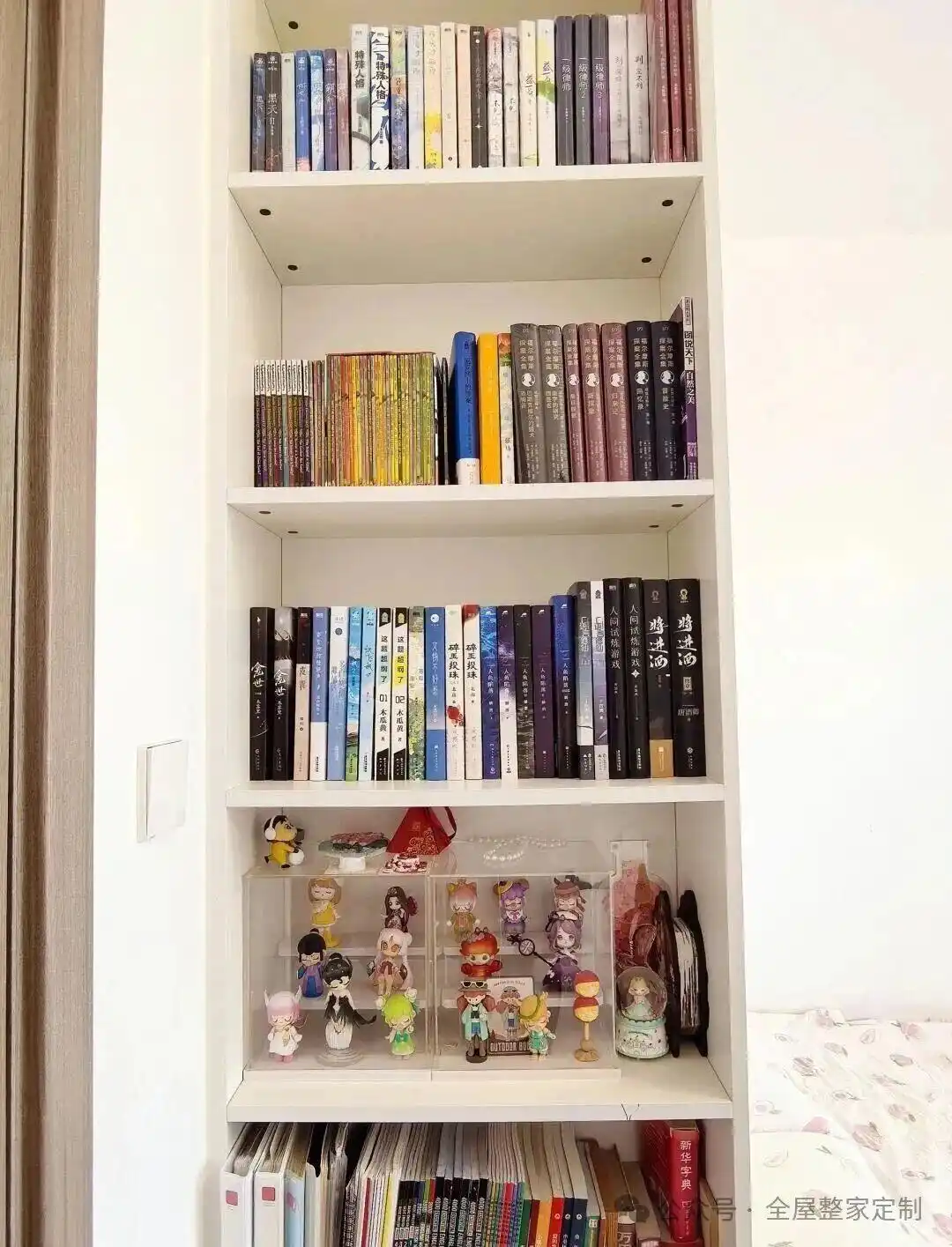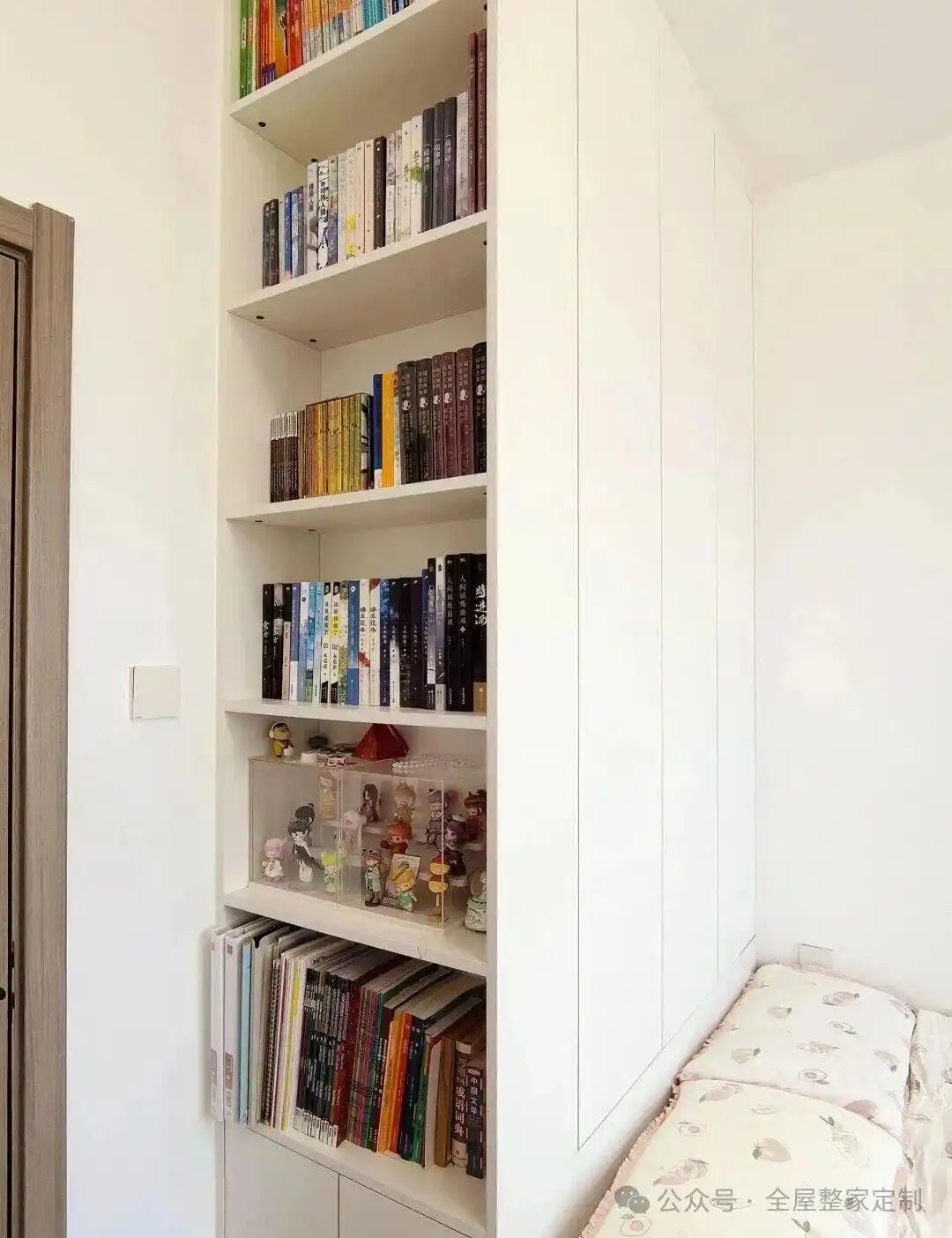 一开始没打算做专门的书柜,想着在书桌上堆几层书就行,结果刚开学两周,课本、练习册就堆得像小山,写作业都得先挪书。后来决定把书柜和衣柜做成一体的,既省空间又能形成视觉整体。 这个书柜高度和衣柜保持一致,都是2.74米,宽度580mm,刚好卡在衣柜和墙角之间,不占额外空间。上半部分做了6个开放格,层板间距30cm,大的绘本、小的漫画书都能放,最上面两层放娃的手办和奖杯,每次同学来参观他都特别骄傲。